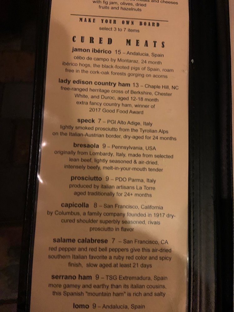 our selection of three italian cured meats (prosciutto,capicolla, felino salame) and three cheeses(sapore del piavepecorino tartufo,pecora fresca) with rustic bread, fig jam, olives, dried fruits and hazelnuts. Selection may change. No substitutions.